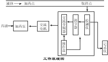 加藥泵電機(jī)在交流變頻器驅(qū)動(dòng)下,將藥劑注入到液體中,藥濃度被檢測(cè)儀檢測(cè),檢測(cè)儀將與濃度成比例的電信號(hào)輸入到調(diào)節(jié)器與設(shè)定值比較,得到偏差信號(hào),調(diào)節(jié)器將偏差信號(hào)按工藝要求進(jìn)行比例、積分運(yùn)算,其運(yùn)算結(jié)果信號(hào)輸送給變頻器,變頻器按調(diào)節(jié)器輸出的調(diào)節(jié)信號(hào)改變電機(jī)工作電源的頻率,使電機(jī)轉(zhuǎn)速發(fā)生變化,改變注入液體中藥液濃度,使藥劑濃度控制在要求范圍內(nèi)。